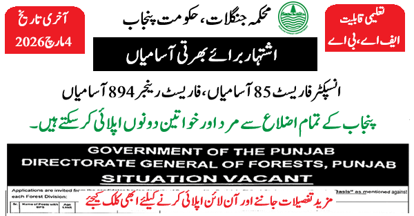 According to recent listings, the Directorate General of Forests, Punjab has announced positions such as Forest Ranger & Inspector Forests across multiple districts in Punjab.