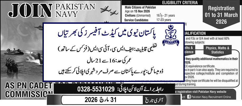 Candidates apply online at the official Pakistan Navy recruitment portal.