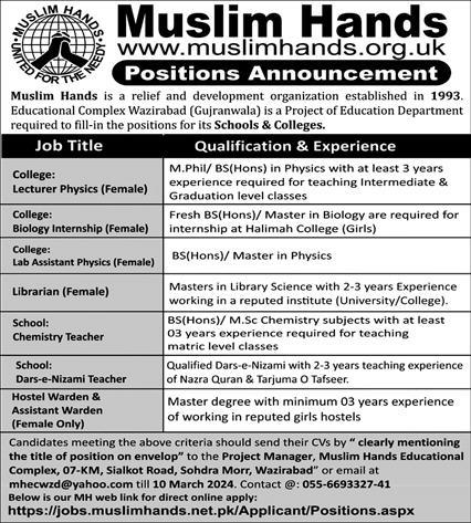 How to apply: Interested candidates should send their cvs by "clearly mentioning the title of position on envelop' to the project manager Muslim Hands Educational Complex, 07-KM, Sialkot Road, Sohdra Morr, Wazirabad.