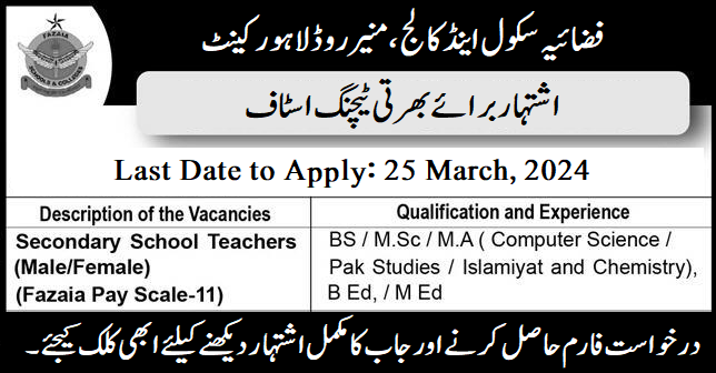 Fazaia Intermediate College Lahore (New Teacher Jobs) Apply Now!
