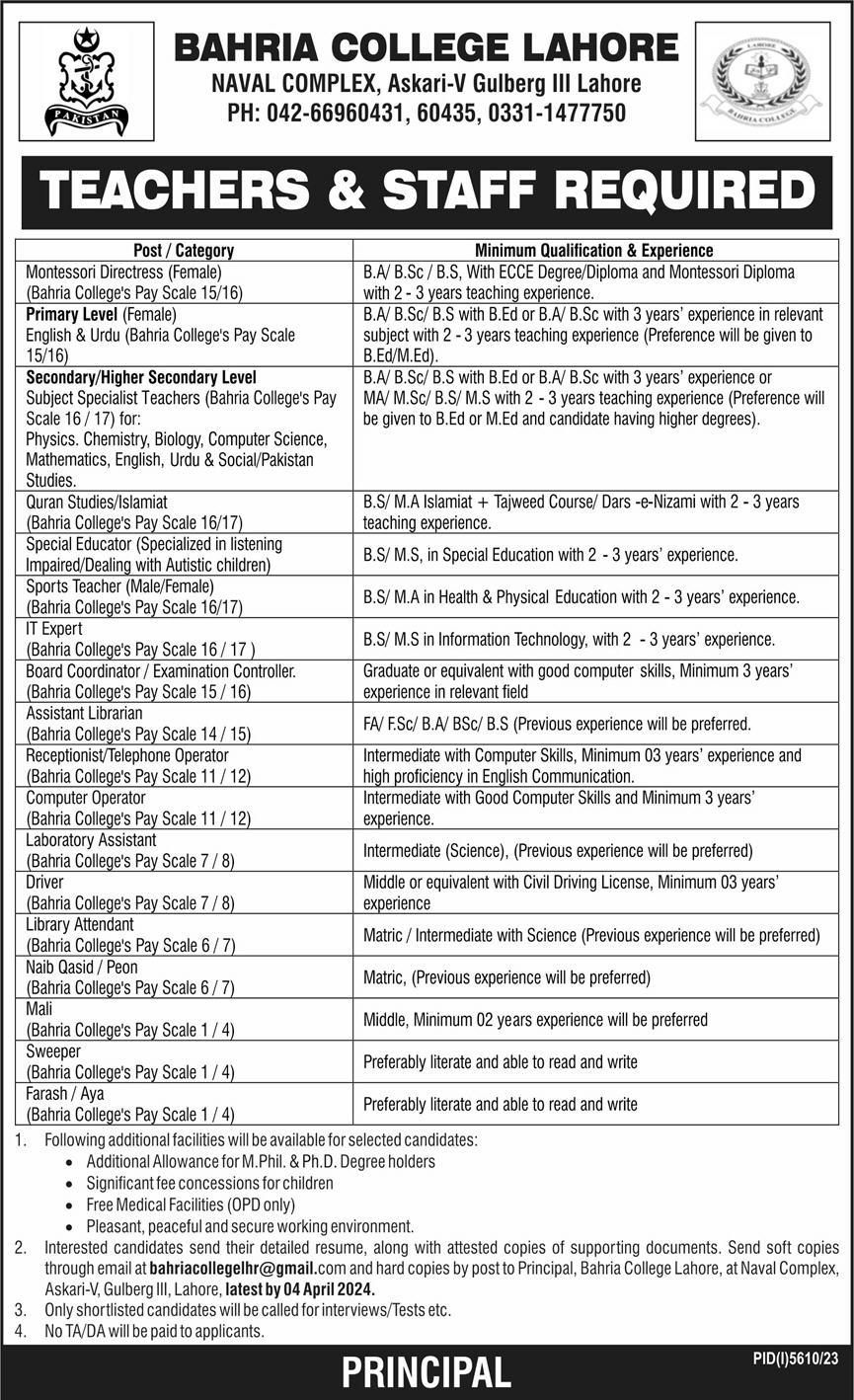 Bahria College Lahore (Staff Required) Apply Now