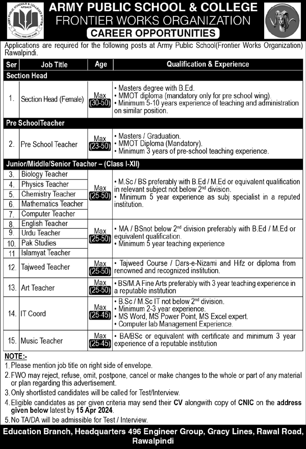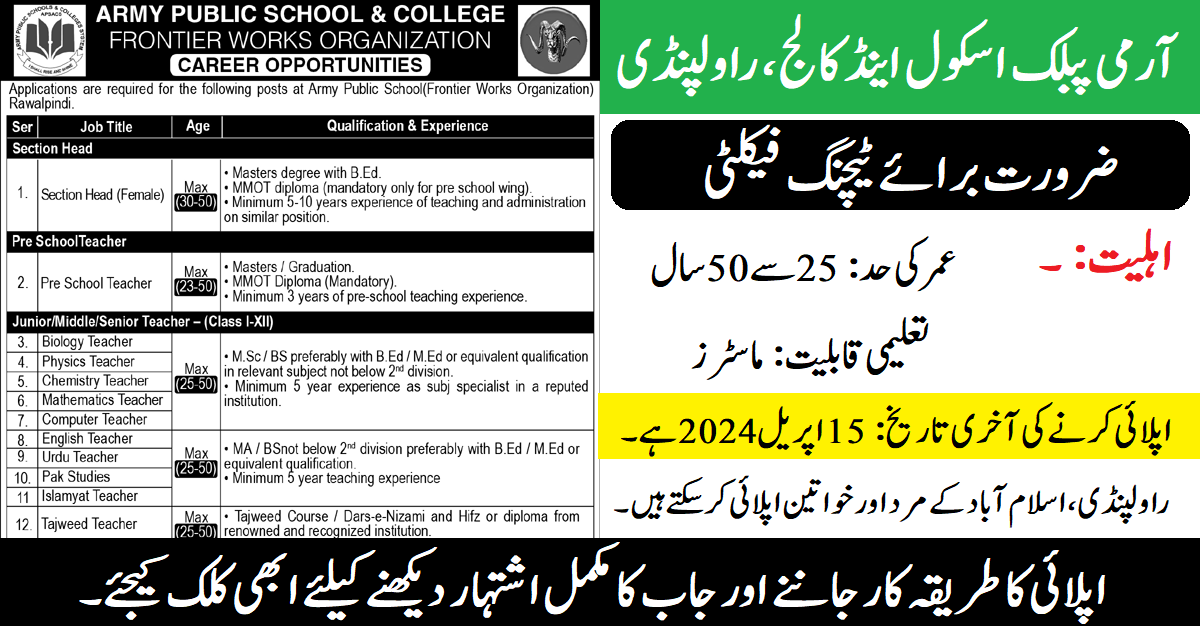 Army Public School FWO (Teaching Jobs April 2024) Apply Now