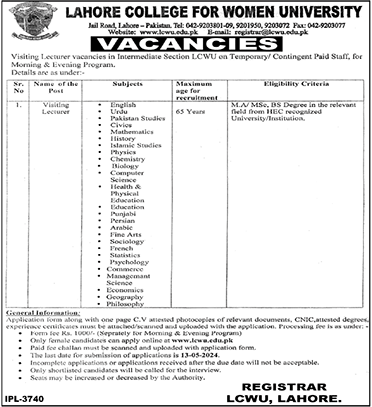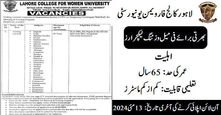 Lahore College for Women University (Female Visiting Lecturer Jobs May 2024)