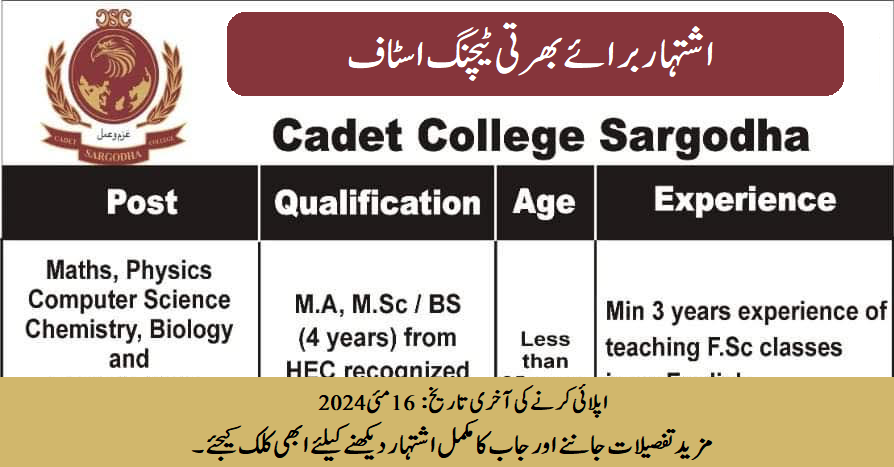 Cadet College Sargodha (College Staff Required) May 2024