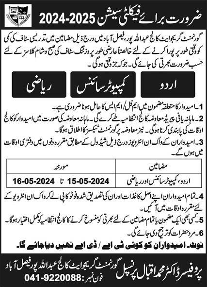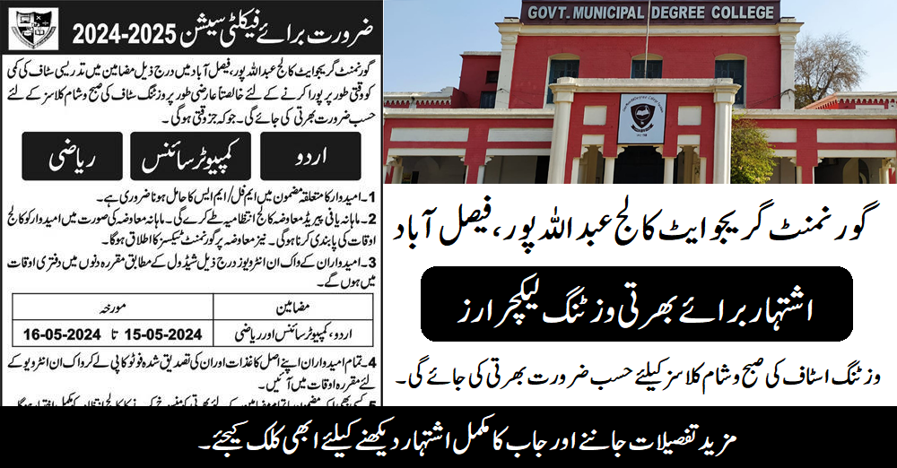 Government Graduate College Abdullahpur (Lecturers Job Latest May 2024)