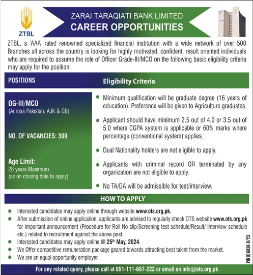 Zarai Taraqiati Bank Ltd (OG-III Latest Jobs May 2024)