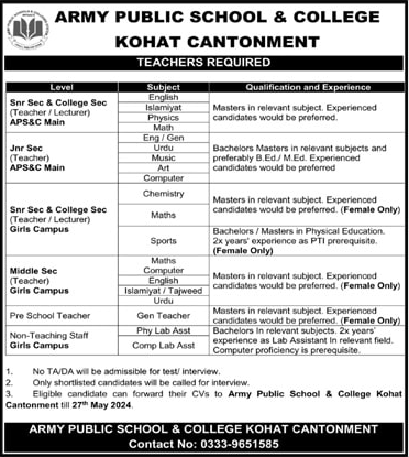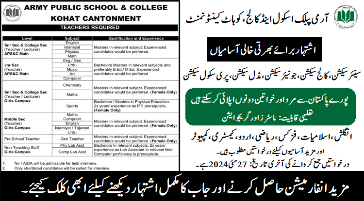 Army Public School and College Kohat (Faculty Required) May 2024