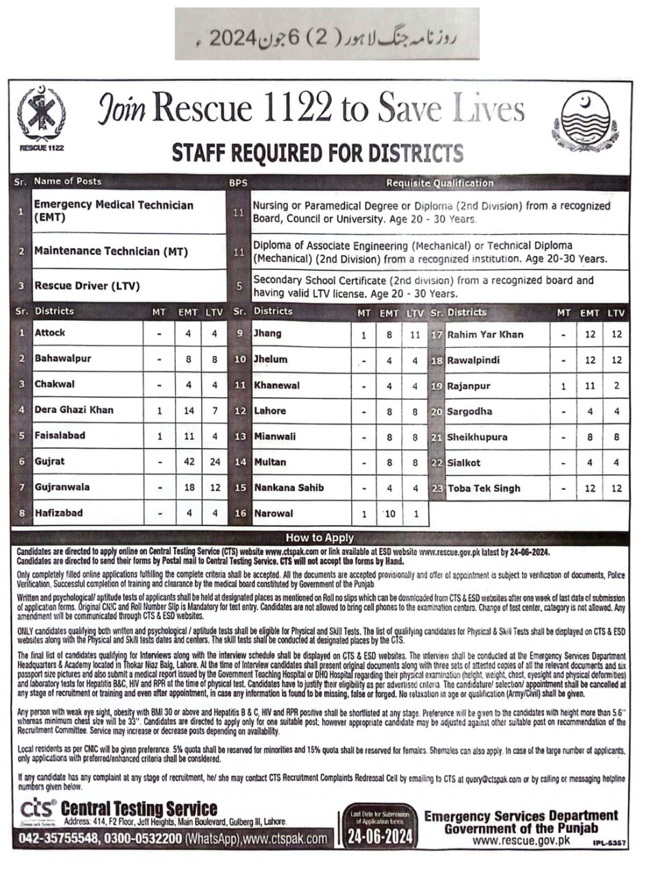 Emergency Services Department (Rescue 1122) Latest Jobs June 2024