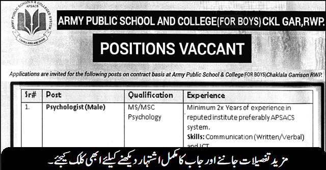 Army Public School For Boys Chaklala Garrison RWP (Teachers Required June 2024)
