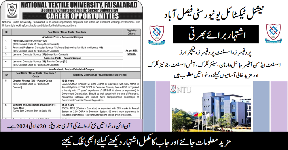 National Textile University - NTU | Faisalabad ) Latest Jobs July 2024