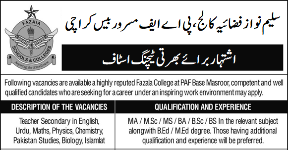 PAF Intermediate College Masroor Karachi (Teaching Faculty Jobs July 2024)