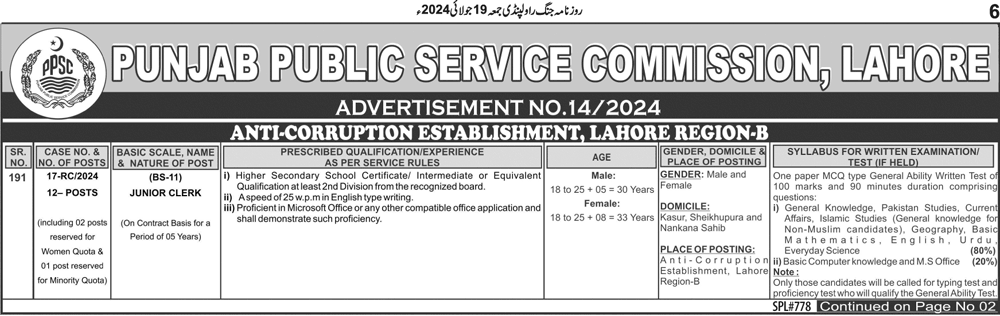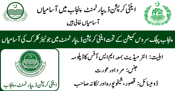 Anti Corruption Establishment, Punjab (Junior Clerk Jobs Latest July 2024)