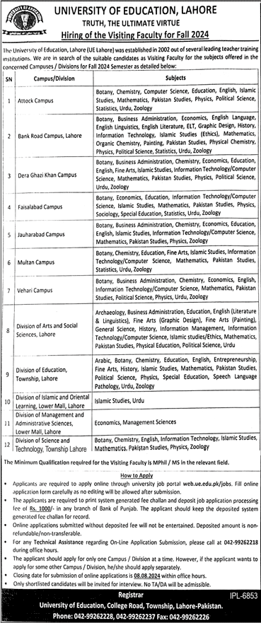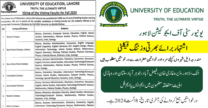 University of Education Lahore (Visiting Faculty Jobs Male and Female July 2024)