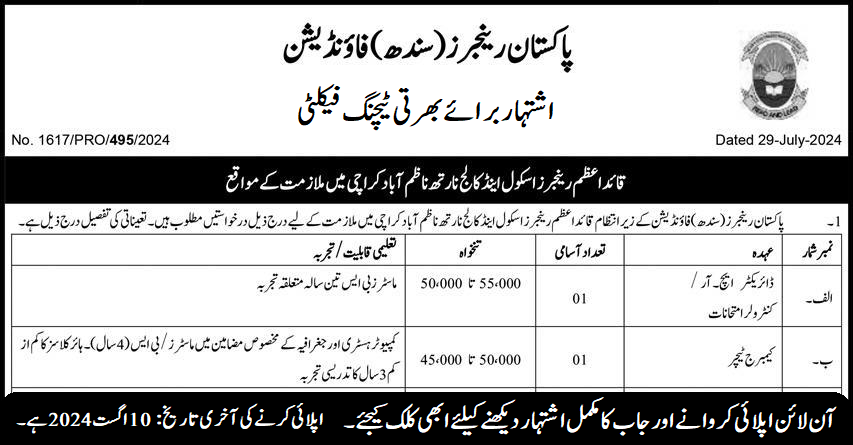Pakistan Rangers Foundation Sindh (Teaching Jobs August 2024)