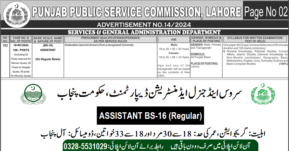 Services and General Administration Department (Assistant BS-16) PPSC