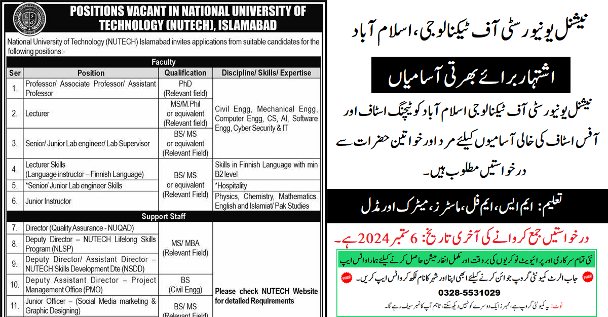 National University of Technology (NUTECH) Latest Jobs September 2024