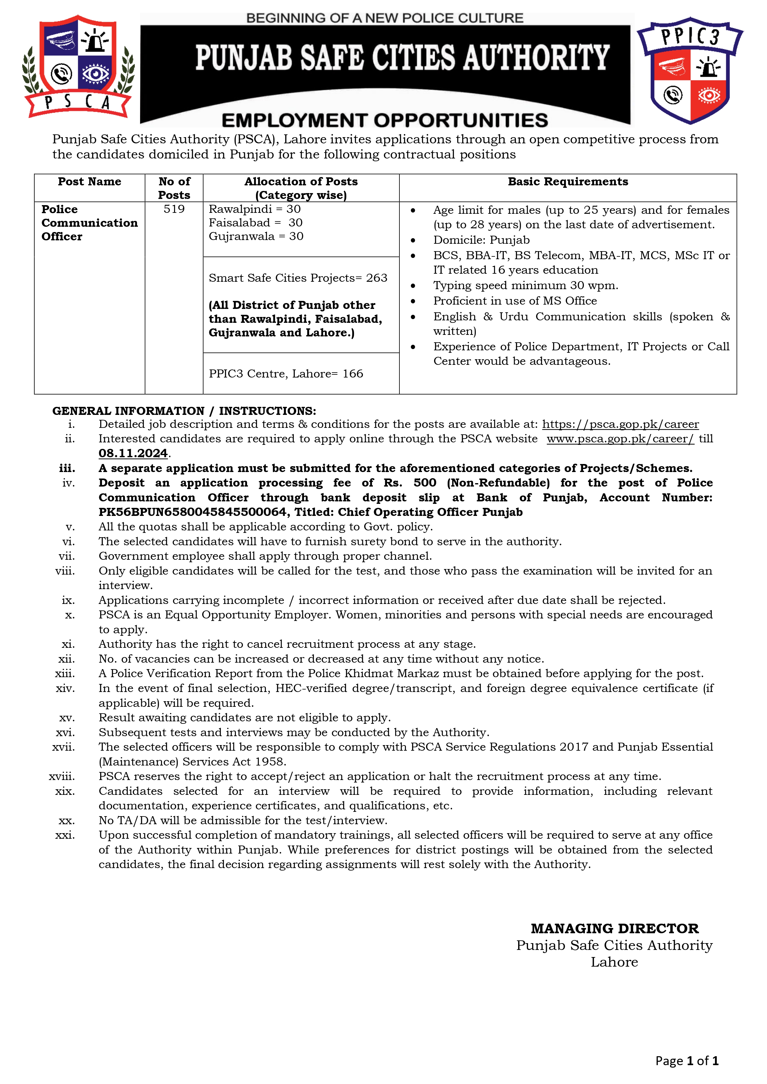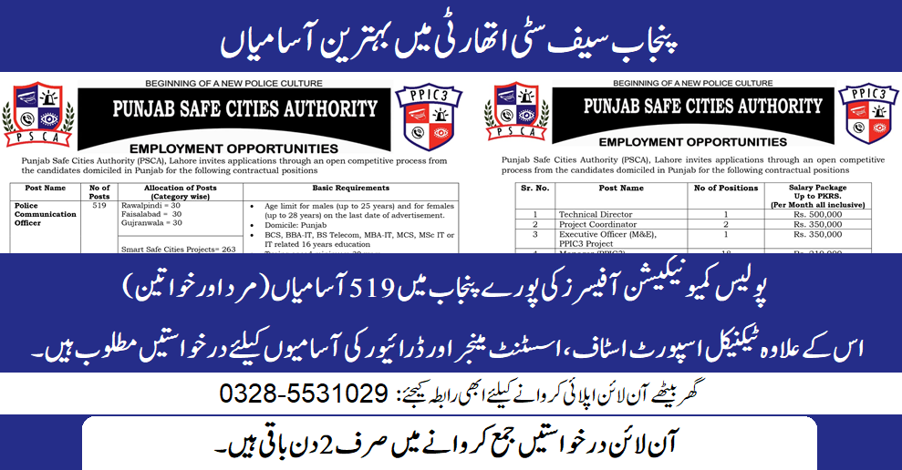Punjab Safe Cities Authority (PSCA) Latest Jobs