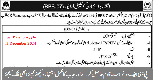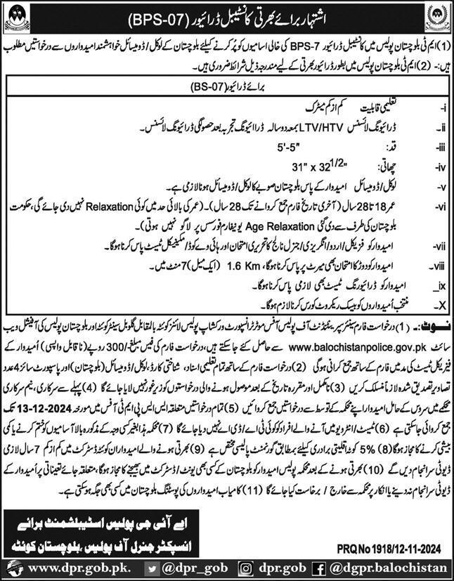 Recruitment in the rank of Constable (BPS-07) Driver in MT Balochistan Police