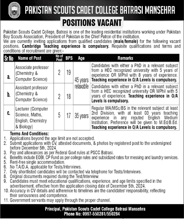 Pakistan Scouts Cadet College Batrasi Manshera (Lecturers Job November 2024)