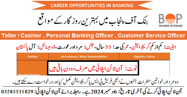 Bank of Punjab Latest Jobs (Male & Female) Apply Now