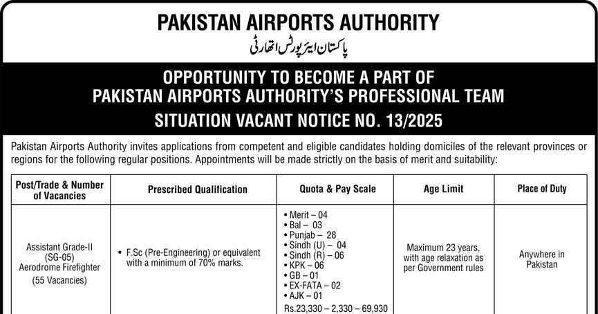 Pakistan Airports Authority invites applications from competent and eligible candidates holding domiciles of the relevant provinces or regions for the following regular positions. Appointments will be made strictly on the basis of merit and suitability: