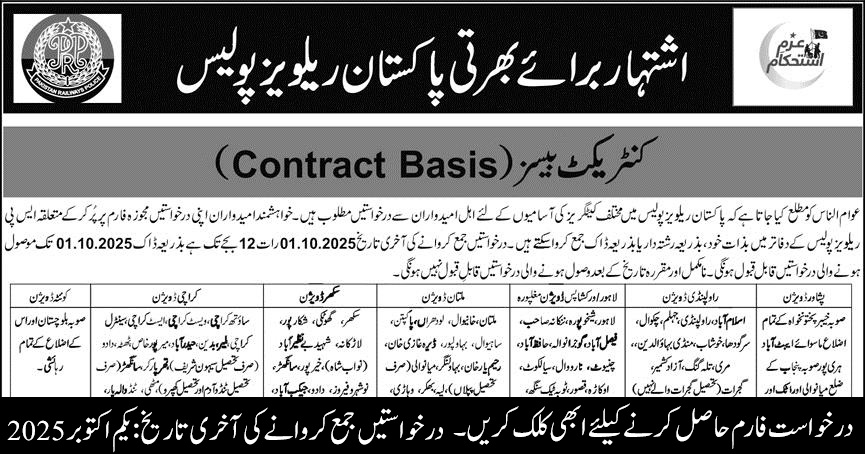 عوام الناس کو مطلع کیا جاتا ہے کہ پاکستان ریلویز پولیس میں مختلف کیٹگریز کی آسامیوں کے لئے اہل امیدواران سے درخواستیں مطلوب ہیں۔ خواہشمند امیدواران اپنی درخواستیں مجوزہ فارم پر پر کر کے متعلقہ ایس پی ریلویز پولیس کے دفاتر میں بذات خود، بذریعہ رشتہ دار یا بذریعہ ڈاک جمع کروا سکتے ہیں۔ درخواستیں جمع کروانے کی آخری تاریخ 01.10.2025 رات 12 بجے تک ہے بذریعہ ڈاک 01.10.2025 تک موصول ہونے والی درخواستیں قابل قبول ہونگی۔ نامکمل اور مقررہ تاریخ کے بعد وصول ہونے والی درخواستیں قابل قبول نہیں ہونگی۔