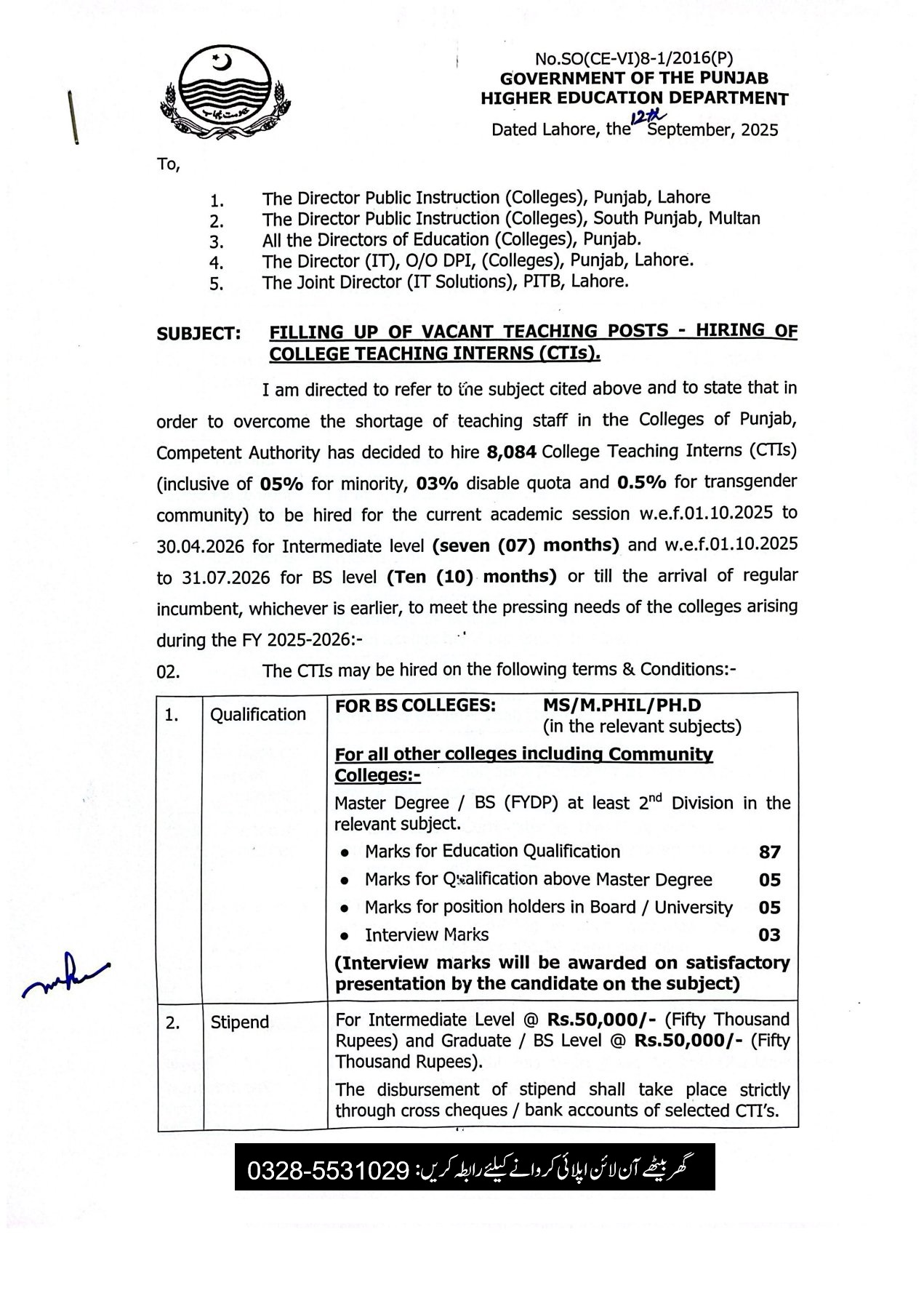 For Graduate Colleges (BS Colleges) : MS/M.Phil/Ph.D (However, in case no candidate with such degree has applied M.A/M.Sc may be considered)