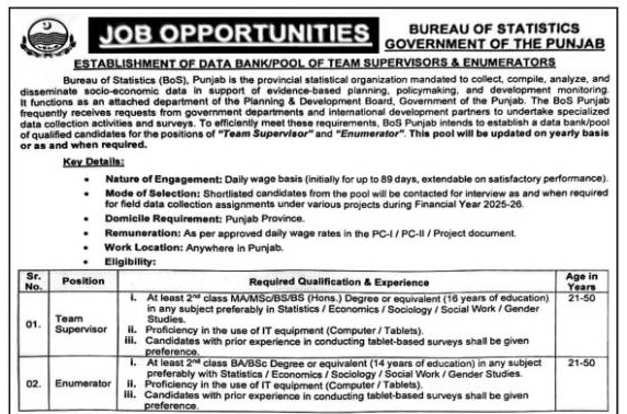 Bureau of Statistics (BoS), Punjab is the provincial statistical organization mandated to collect, compile, analyze, and disseminate socio-economic data in support of evidence-based planning, policymaking, and development monitoring. It functions as an attached department of the Planning & Development Board, Government of the Punjab. The BoS Punjab frequently receives requests from government departments and international development partners to undertake specialized data collection activities and surveys. To efficiently meet these requirements, BoS Punjab intends to establish a data bank/pool of qualified candidates for the positions of "Enumerator". This pool will be updated on yearly basis or as and when required.