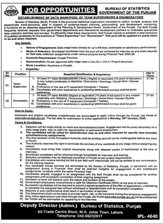 Interested and eligible candidates (male/female) are encouraged to apply online through the Punjab Job Portal at www.jobs.punjab.gov.pk. The last date for submission of online applications is Monday, 6th October, 2025.